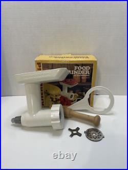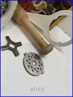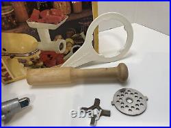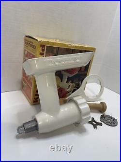 Many good vibes on this machine because I was allowed to use it young at just age ten and I made many fantastic treats with it. Meat grinder – 3 grinds. Slicer 1 thin 1 thick. Chopper 1 thin 1 thick.